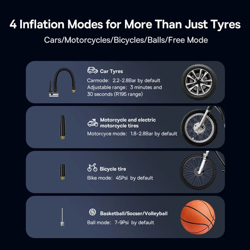 • Multiple Inflation Modes: Easily switch between modes to accommodate various inflation needs, from tyres to sports balls.