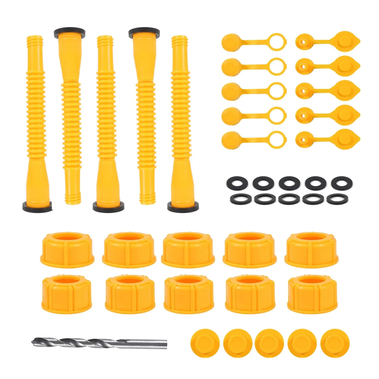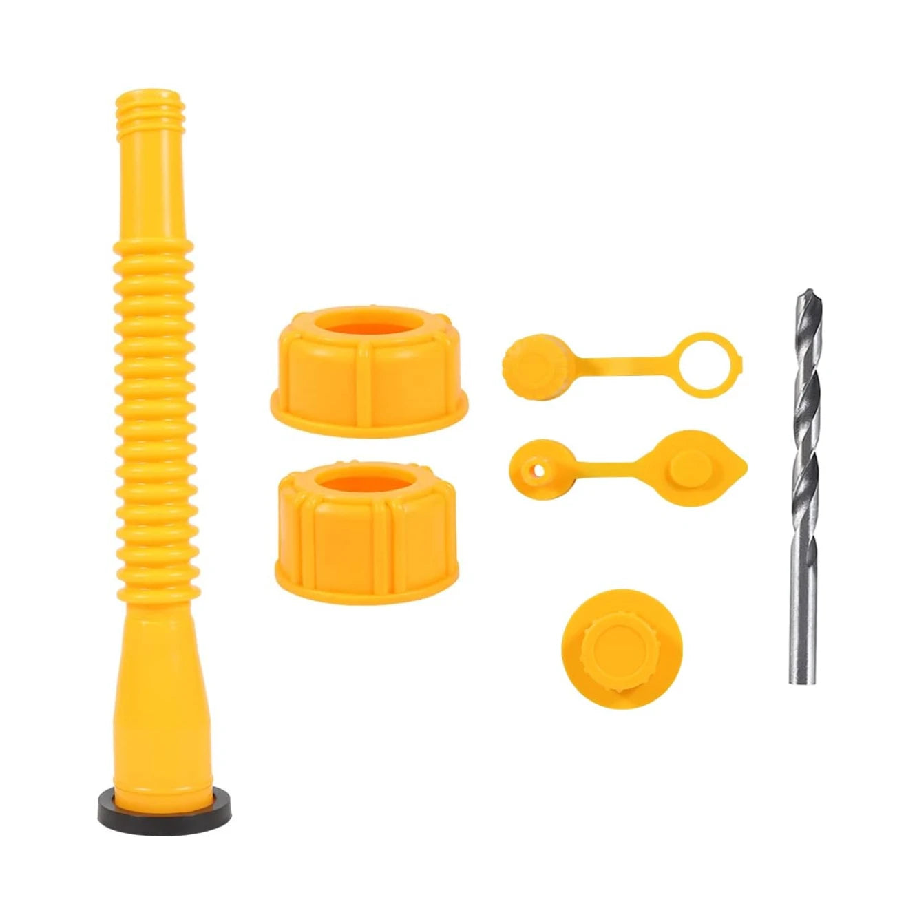 Este kit de reemplazo completo incluye todo lo que necesita para actualizar su bidón de gasolina. Incluye un pico amarillo, dos tapas de collar roscadas (rosca gruesa y fina), una cubierta de boquilla, una arandela de sellado y dos tipos de tapas de ventilación. La instalación es rápida y sencilla, lo que hace que sea muy fácil renovar su bidón de gasolina con una boquilla completamente nueva que evita derrames y garantiza un flujo de combustible uniforme. Además, se incluye una broca para la instalación de la tapa de ventilación, lo que lo hace adecuado para bidones con o sin ventilación existentes.